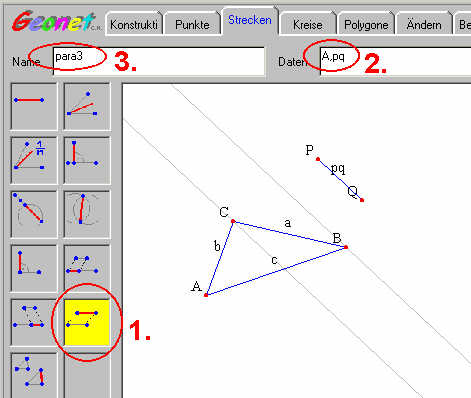 1. Konstruiere von allen drei Dreieckspunkten je eine Parallele zum