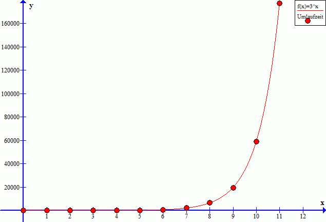 Untersuchung der Unendlichkeitsmaschine Was hat das nun mit Exponential- und Logarithmusfunktionen zu tun? Wenn man die Drehzahlen der Zahnräder untersucht (s.o.) fällt einem schnell auf, dass die Umlaufzeit aufeinander folgender Zahnräder gleicher Größe um einen konstanten Faktor steigt. Bedingt durch die Geometrie der Zahnräder ergibt sich in unserem Beispiel der Faktor 36/12=3. Also hat jedes Zahnrad eine dreimal höhere Umdrehungsdauer als das auf der davorliegenden Welle. Wir können davon ausgehen, dass ein Zahnrad in der 0. Stufe - also das getriebene Zahnrad - eine Umdrehungsdauer von genau einer Sekunde hat. Für unser 12-stufiges Modell würde sich also die folgende Tabelle ergeben: |